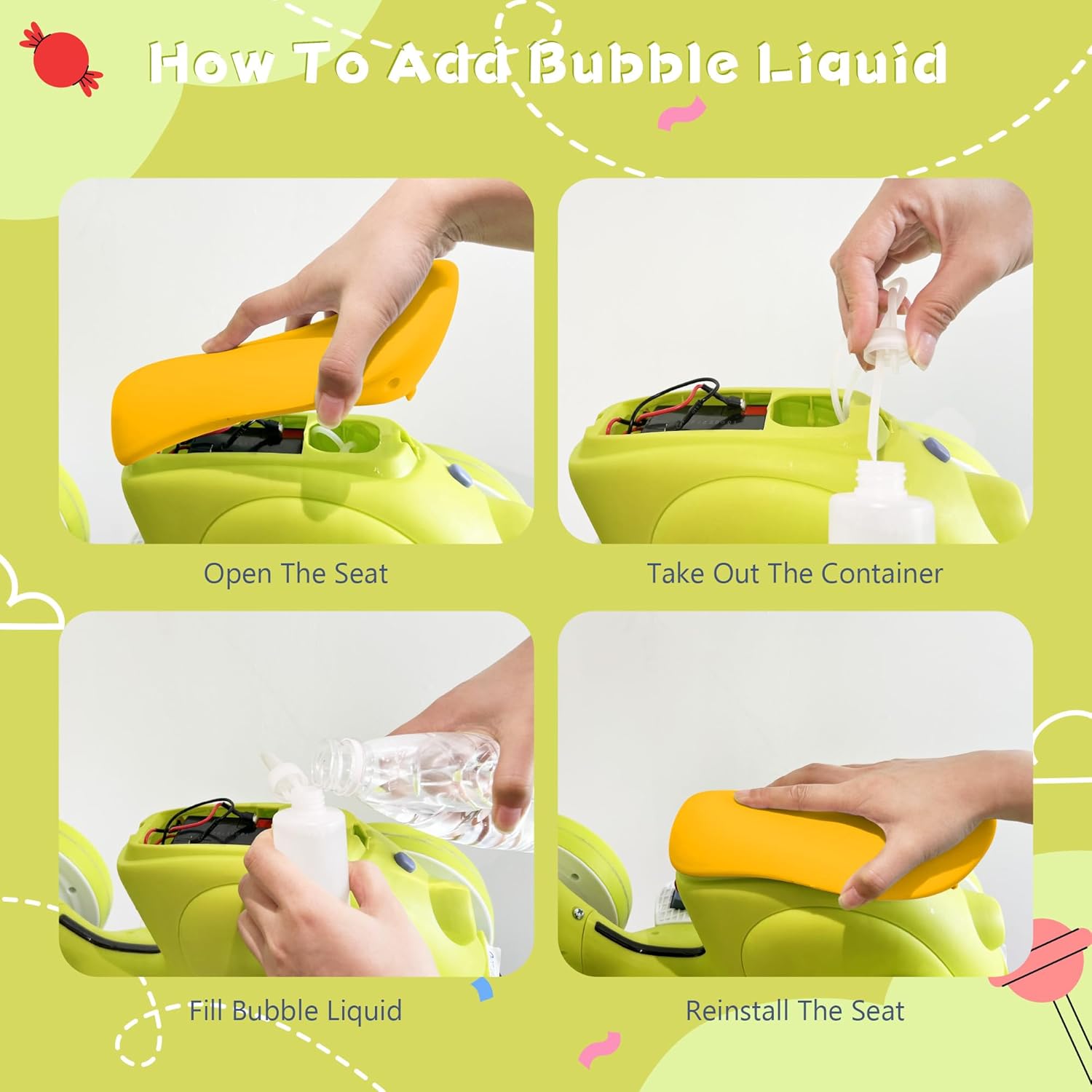 - Comfortable Children Balance Motorbike with Remote & Bubble Machine: Our ride-on toy features a non-slip soft handlebar designed for small hands, while the wider and thicker seat offers excellent shock absorption. With durable EVA wider tires that are noiseless and gentle on wooden floors, and 4 wheels for a smooth ride on various surfaces, it's perfect for both indoor and outdoor activities.