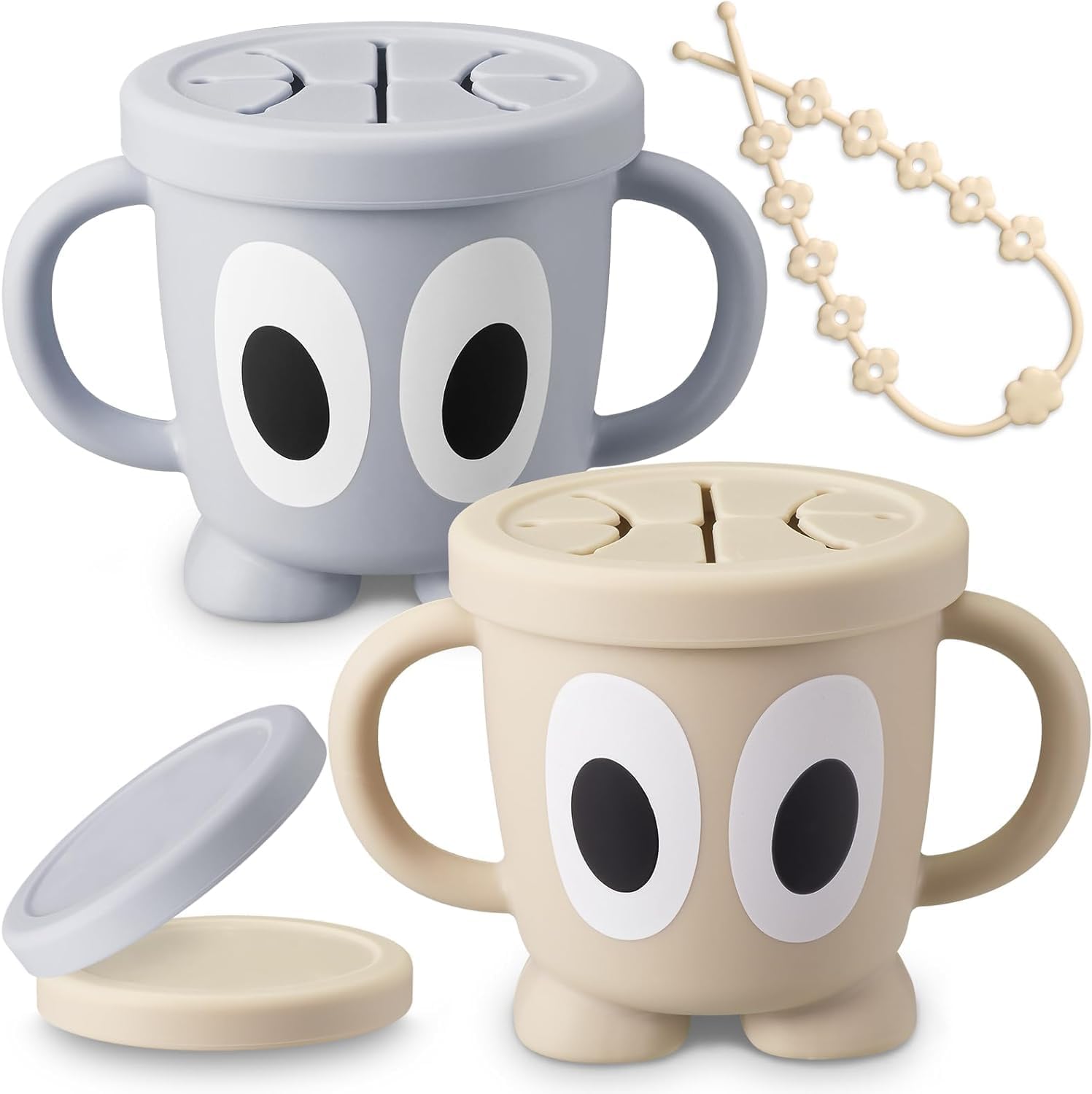 - No Spill Snack Cup - What sets our spill proof toddler cups apart is its adorable design, featuring cute big eyes and tiny feet adding a touch of charm to snack time. The soft flaps allows baby to reach inside comfortably, while also preventing food from falling out. With double handles for babies to grasp tightly, designed for small hands, so that children hold the small cups independently.