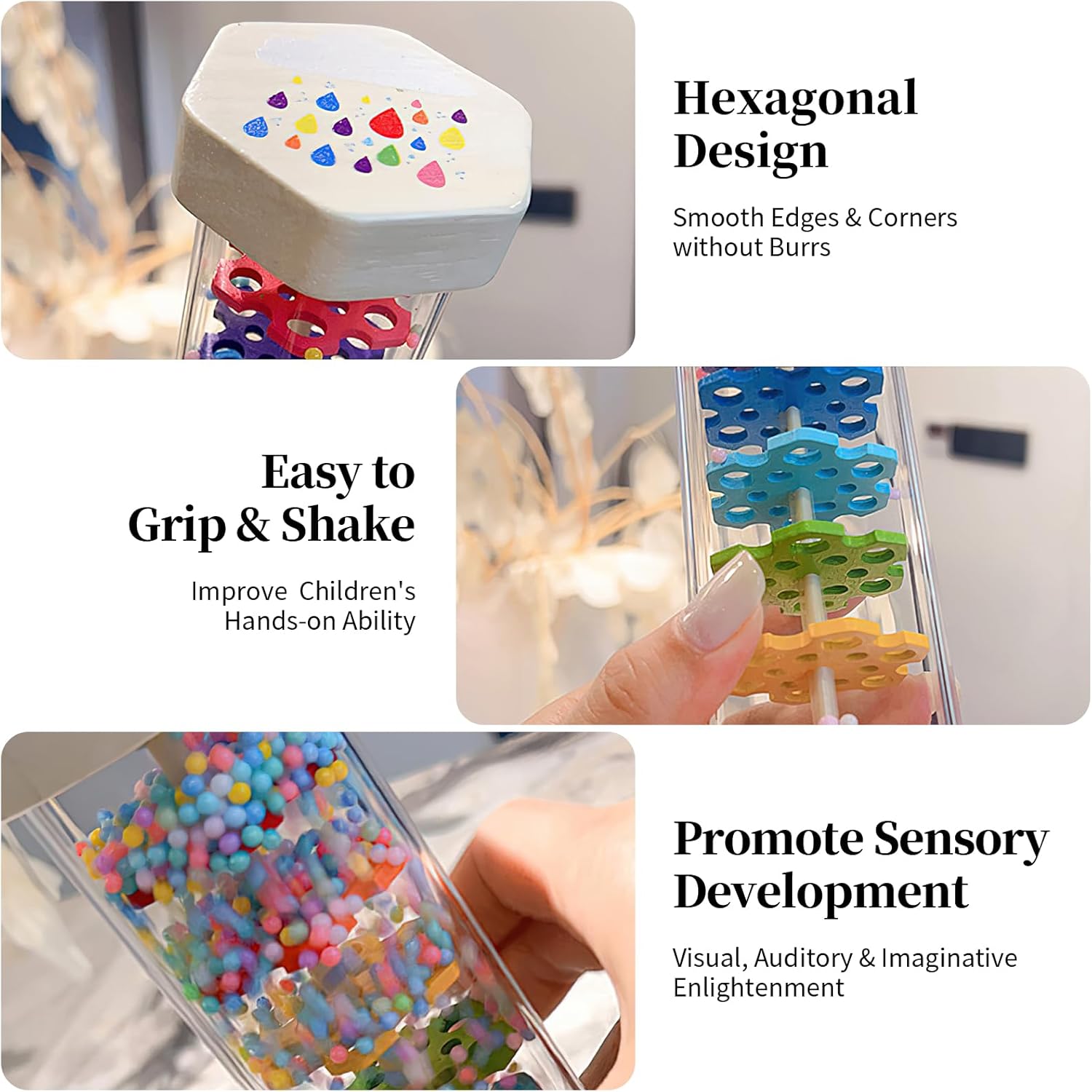 - Baby Sensory Toys: Wodi rainmaker is the perfect Montessori toy for babies 0-6 6-12 months and older. It helps children develop color recognition skills by learning and discovering various colors, helps children practice visual tracking skills by watching the ball's movement, and develops their auditory sensory skills by listening to the sound of rain. The easy-to-grip rain tube design promotes the development of babies' grasping ability. A must-have for 6-month-old babies