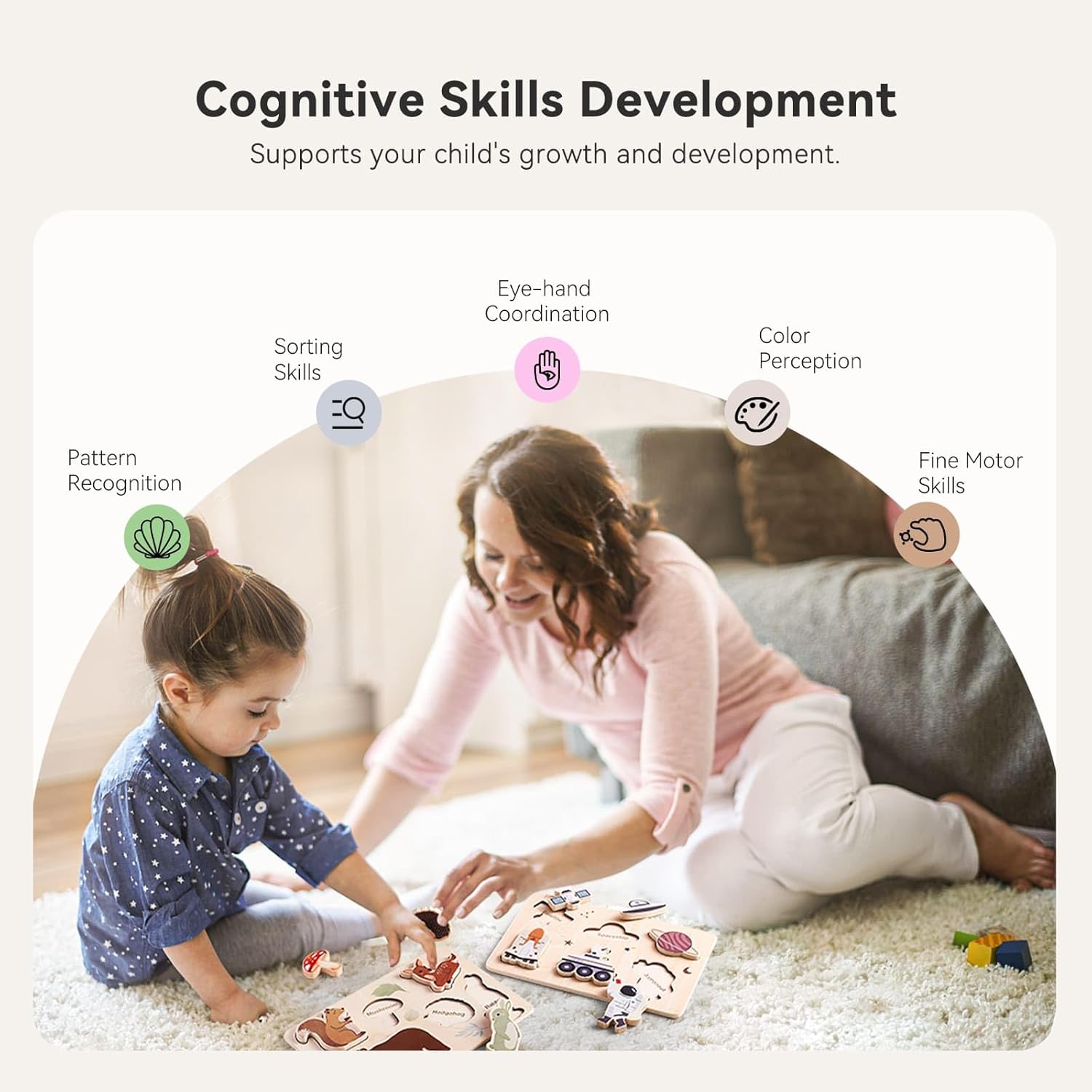 IEATFO 3 Packs Space Ocean Forest Wooden Chunky Puzzles for Toddlers, Wood Puzzle for Kids, Insert Puzzles Each Piece Fits Perfectly, Sturdy and Pegless, Educational Toys