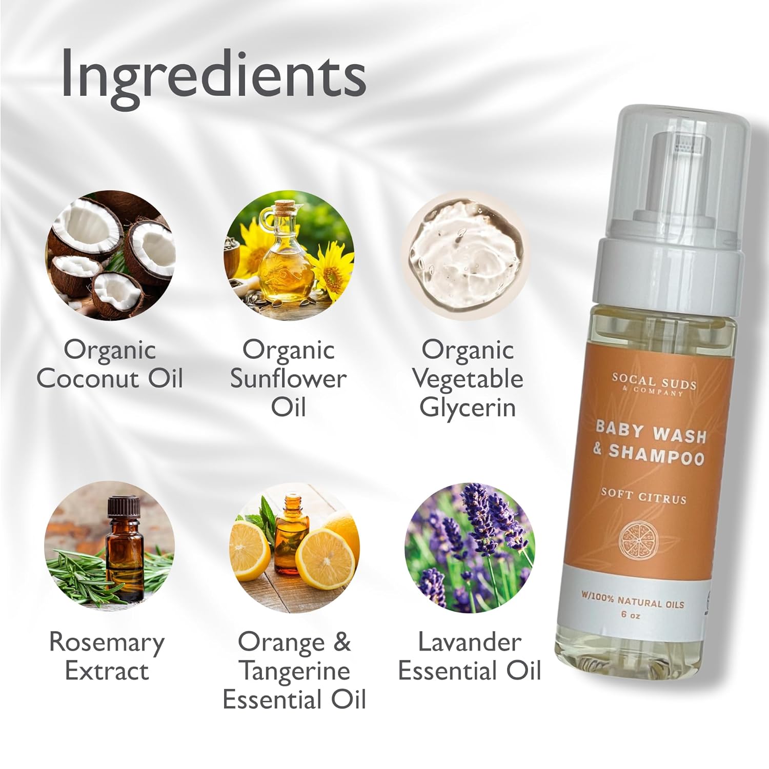 SoCal Suds & Company - Organic Foaming Baby Wash & Shampoo - Gentle Cleansing Newborn Body & Hair Soap for Sensitive Skin - Clean Natural Soothing Ingredients - Soft Citrus, 6oz, 2-Pack