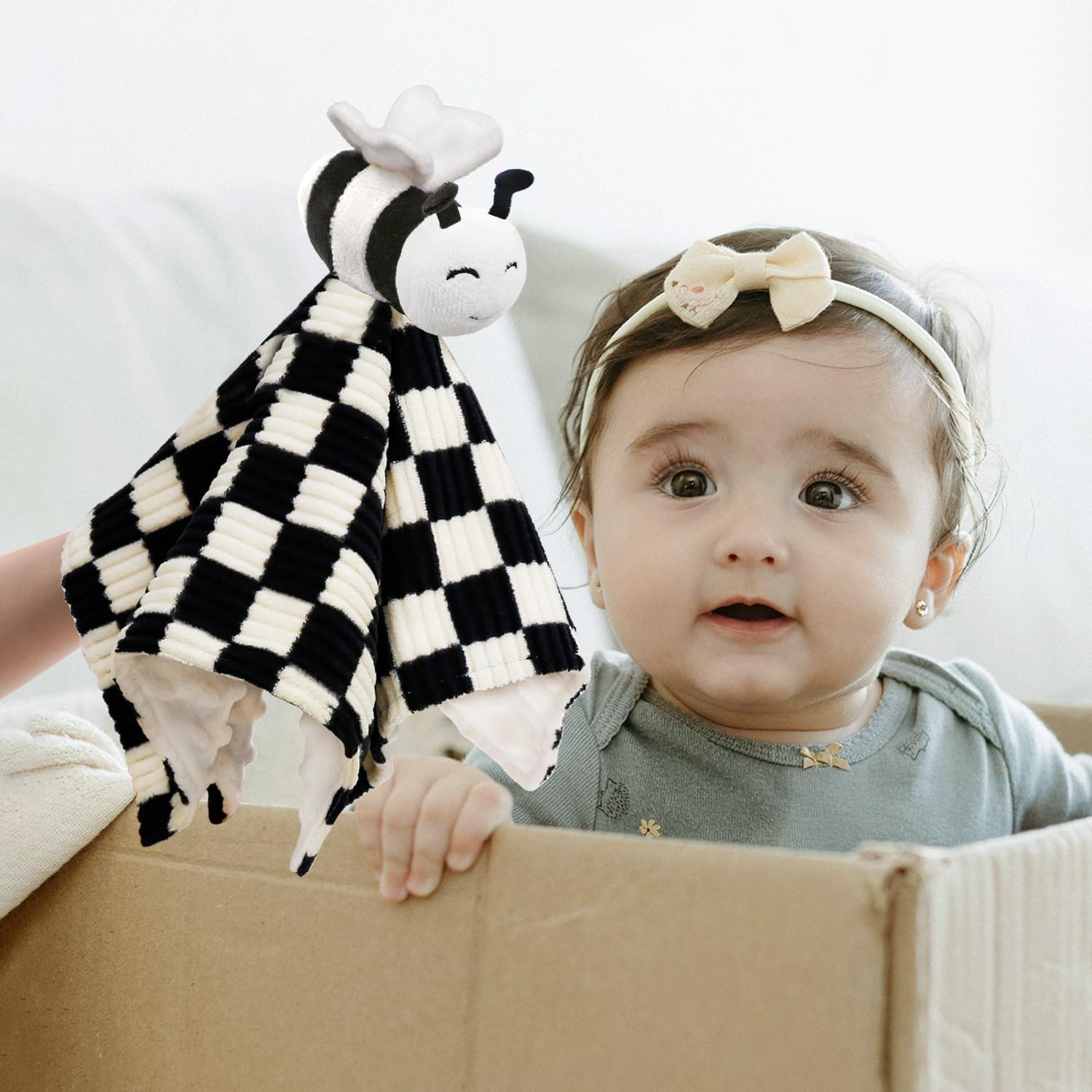 High Contrast Baby Security Blanket for Boys Girls 3D Soft Checkerboard Gingham with Minky Dot Fabric Backing Bee Snuggle Stuffed Animal Lovely Black 14 Inch
