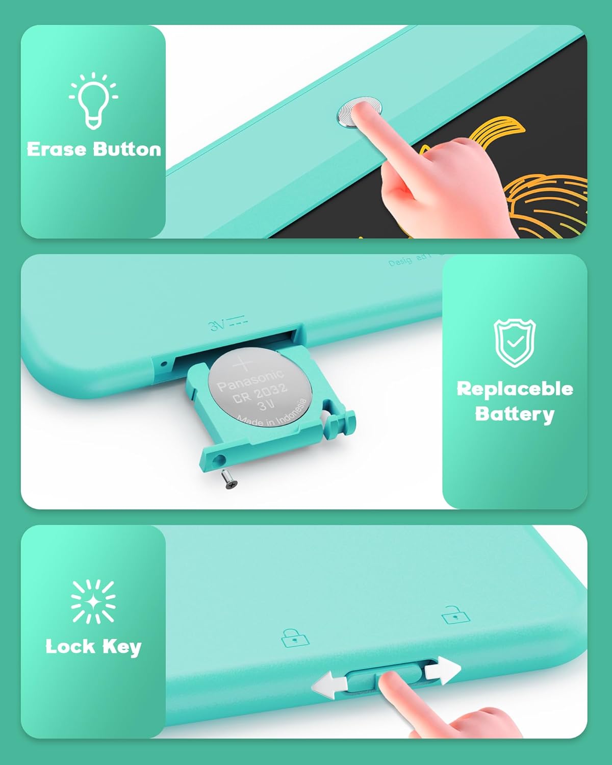 - EYE PROTECTION COLOR SCREEN: 10-inch LCD colorful screen, easy for viewing and graffiti, free child’s imagination. This kids drawing tablet without radiation, no glare, safe and comfortable, even kids use for a long time. Learning education toys birthday gifts for girls age 3.