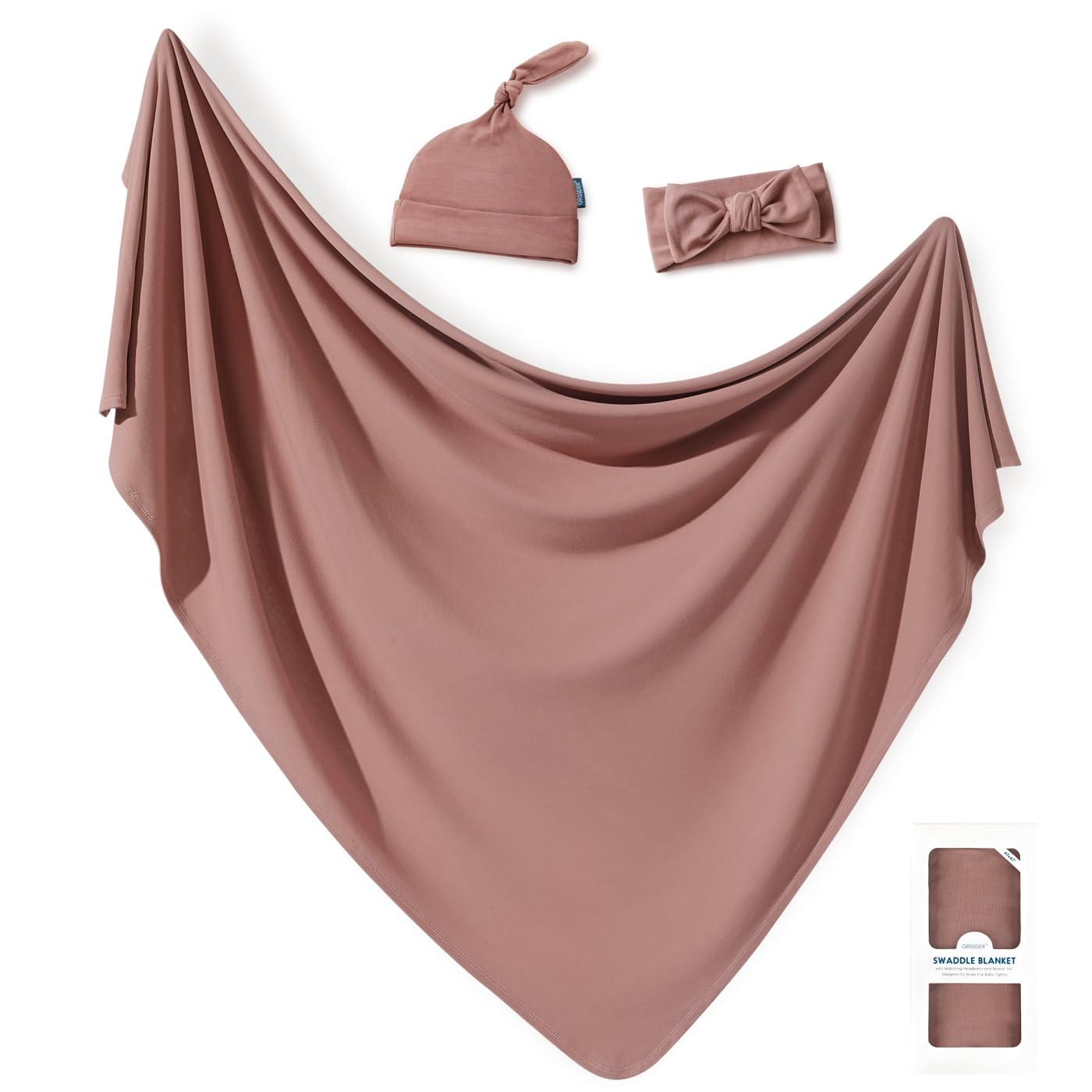 GRSSDER Newborn Swaddle Blanket, Ultra Soft Jersey Receiving Blanket with Matching Headband and Beanie Set, 47×47" Extra Large Nursery Swaddle Wrap for Girls and Boys