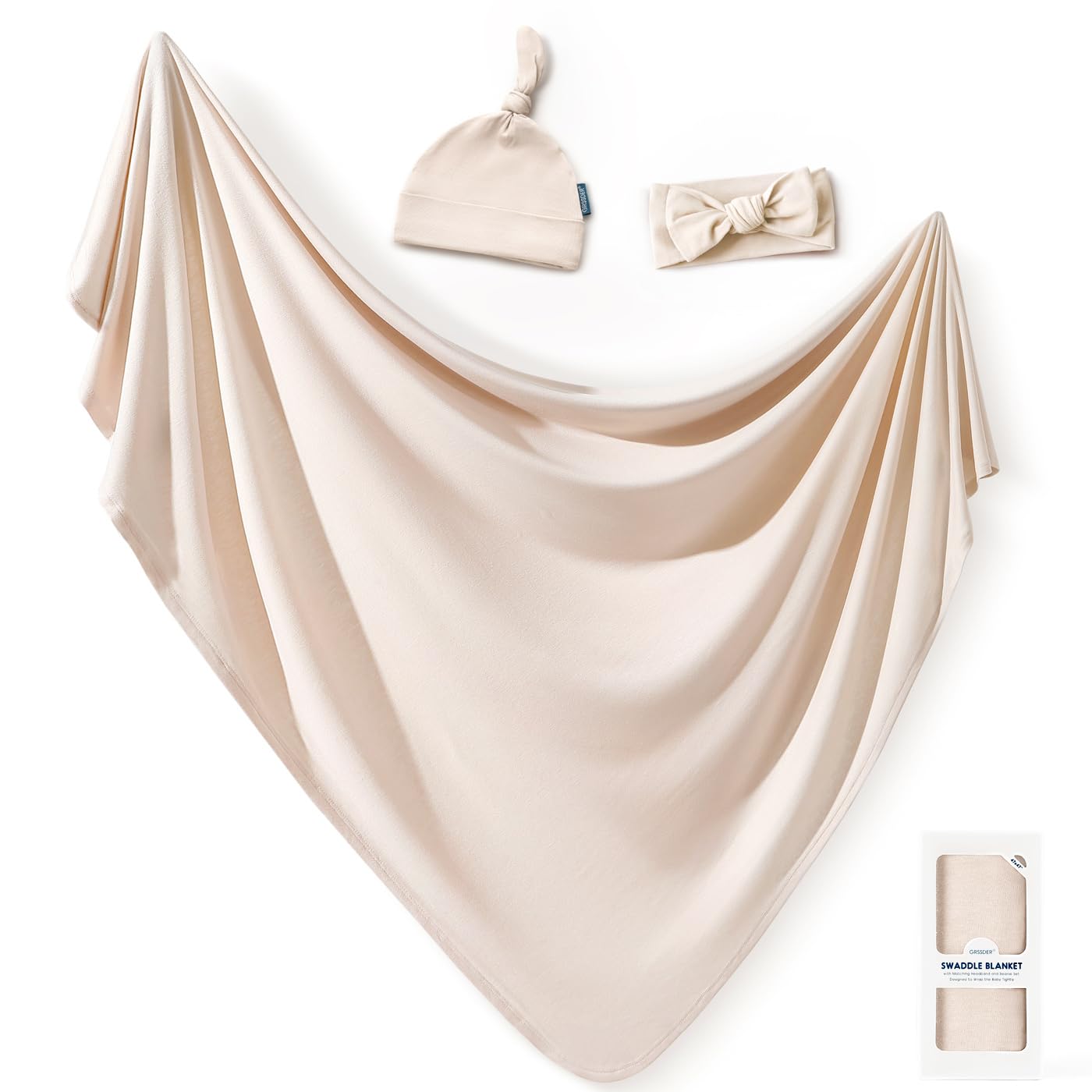 GRSSDER Newborn Swaddle Blanket, Ultra Soft Jersey Receiving Blanket with Matching Headband and Beanie Set, 47×47" Extra Large Nursery Swaddle Wrap for Girls and Boys