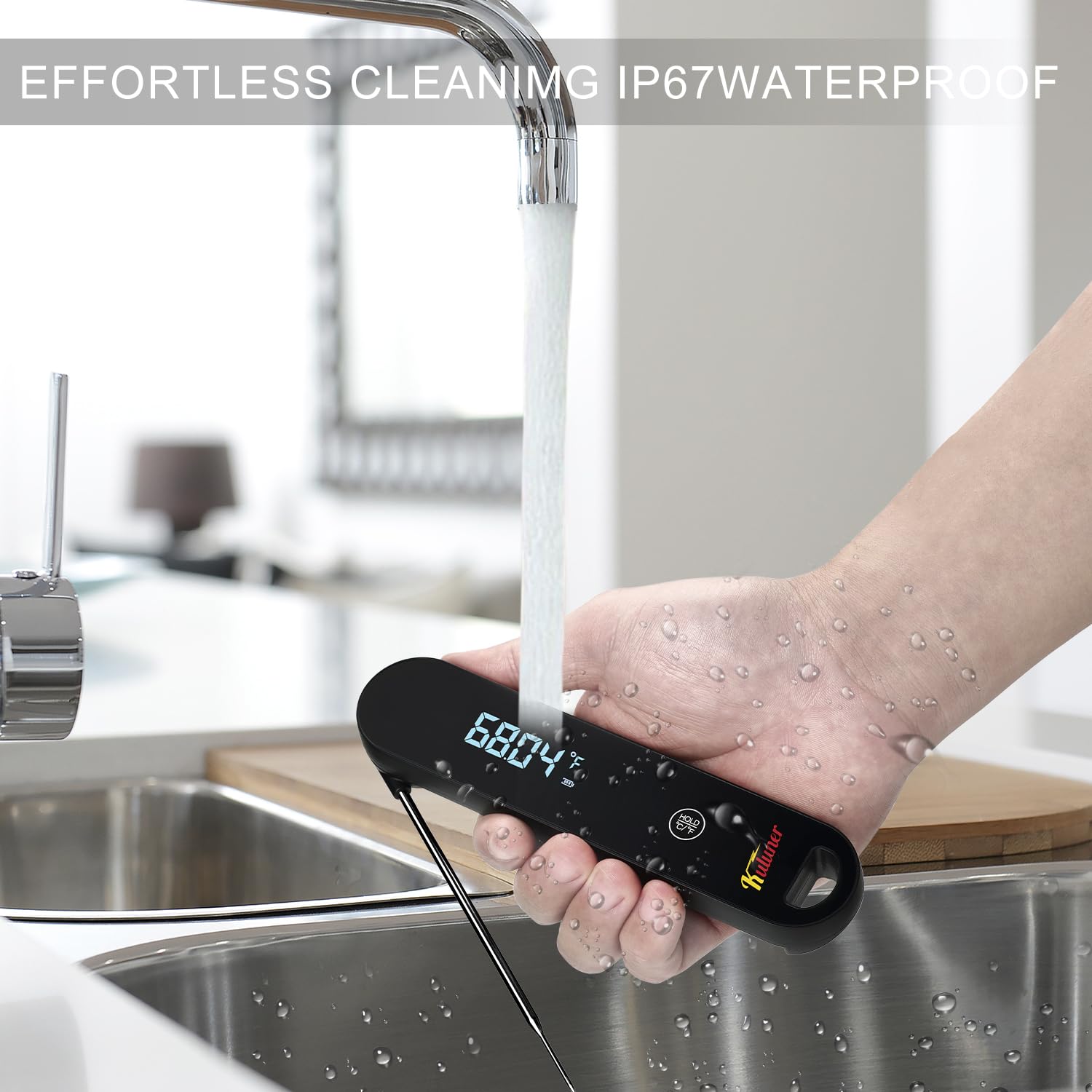 - Waterproof & Smart: KULUNER thermometer is IP67 waterproof, so you can easily rinse it off under the faucet after use (no dishwasher needed). It also lets you switch between °C and °F with a breeze and has a hold function to lock in readings.