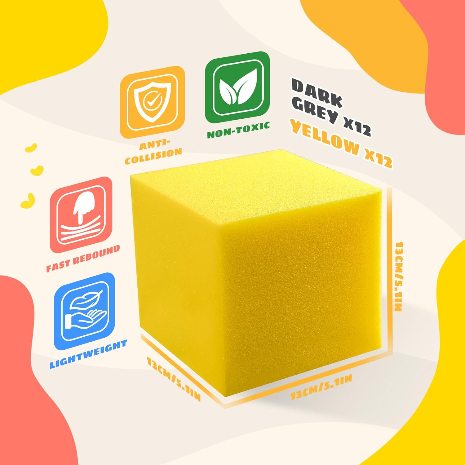 Foam Pit Cubes, 24 PCS 5 Inches Gymnastics Foam Blocks Trampoline Blocks, Multi-Sport Protective Padding for Gymnastics, Trampoline, Parkour, Skate Parks & BMX - Dark Grey & Yellow