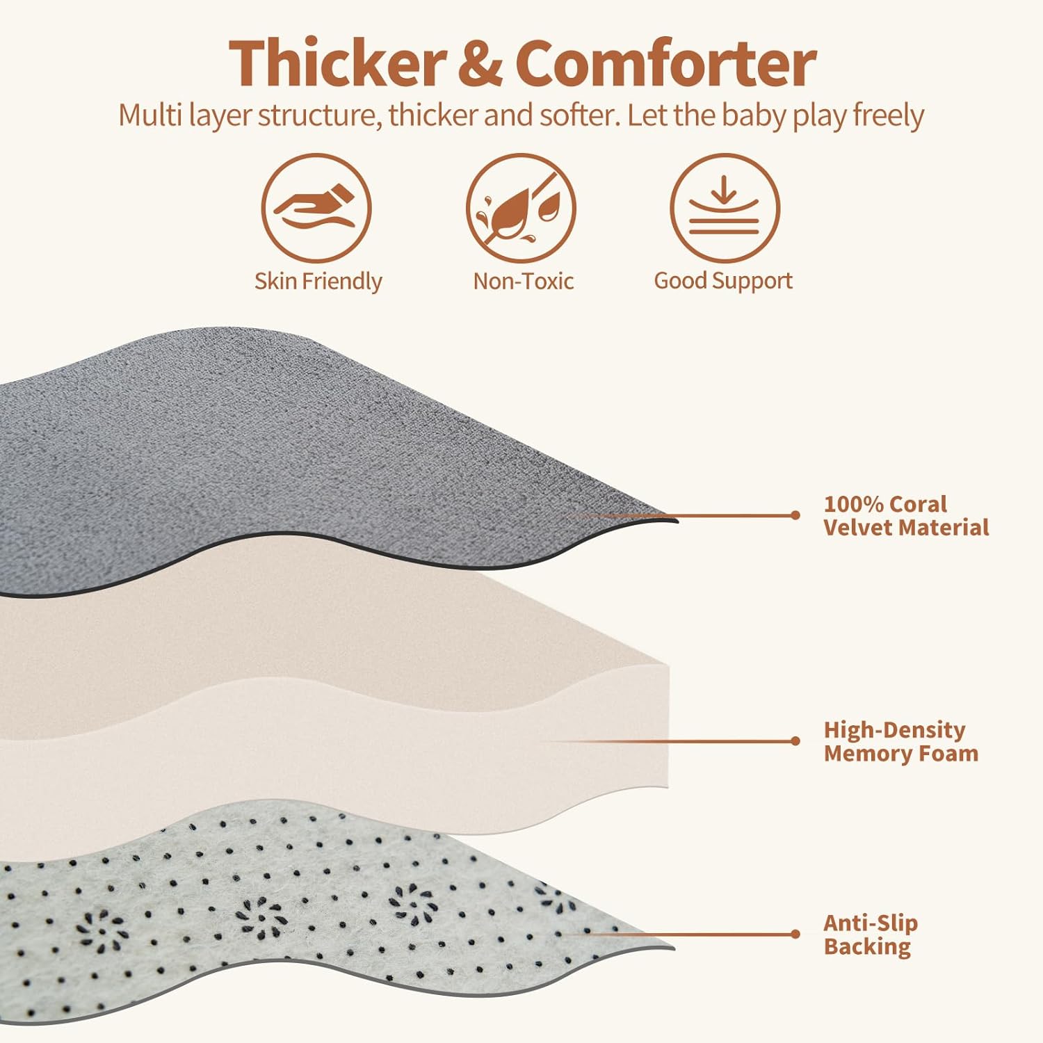 - 【1.4in Thickened Memory Foam Play Mat】Crafted from ultra-soft velvet fabric with high-density memory foam padding, this play mat measures approximately 1.4 inches thick. The SUNYRISY nursery baby rug offers a breathable, comfortable surface that is gentle on baby's skin and resistant to color fading. Its thick padding helps cushion falls, making playtime safer and more enjoyable for toddlers.