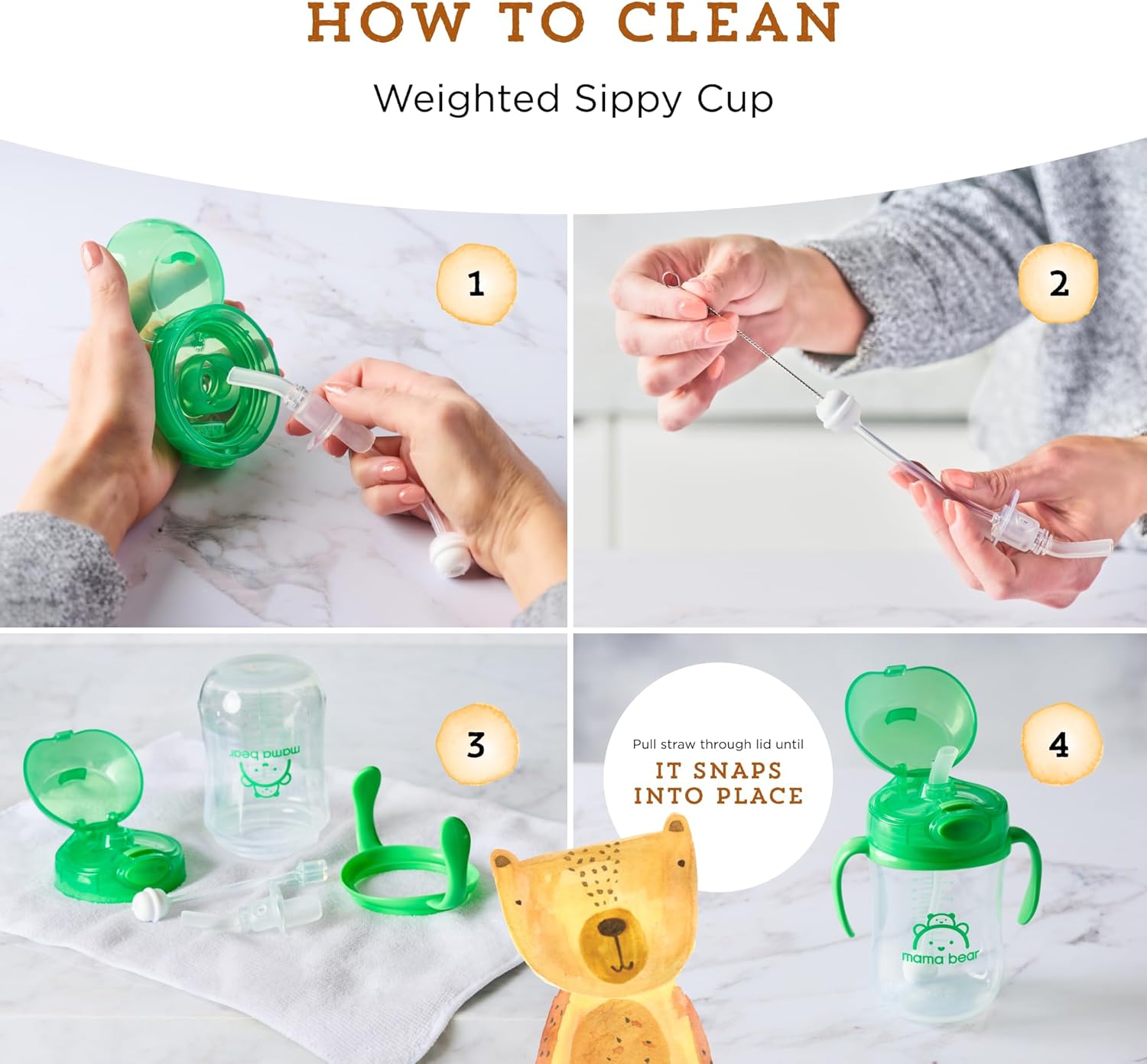 - Easy to assemble and clean (cleaning straw included); make sure the straw is snapped in place after cleaning (rubber collar should be visible)