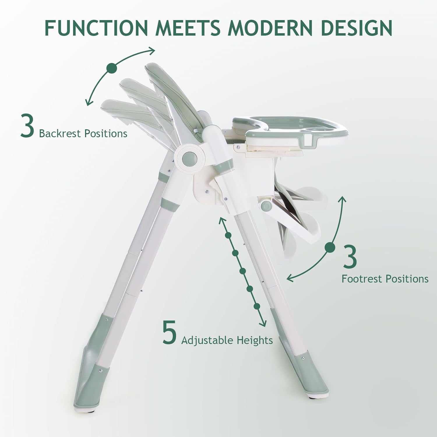 - Adjustable High Chair: The high chair offers a versatile and convenient solution for your growing child, it has 5 adjustable heights, 3 positions for the back rest and 3 options for the foot rest to ensure optimal comfort for your little one during mealtime