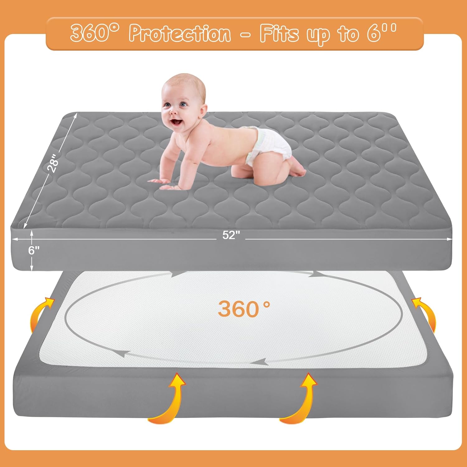- Waterproof Function: Our crib mattress cover provides the perfect combination of cushioned comfort and complete waterproof protection to ensure a better night's sleep, it can fully protect moisture from baby’s skin faster and keep your mattress clean by absorbing spills, sweat and any liquids.There is no worry about those leaky bottle messes or potty training misses anymore!