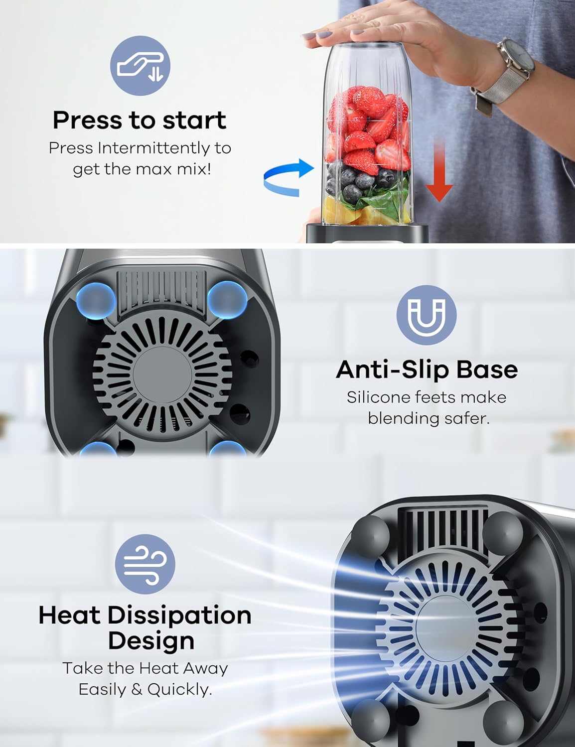- GREAT BLENDING: This Countertop blender for kitchen comes with Food Grade 304 stainless steel blades for all purposes blending, that can make smoothies, shakes, juices, frozen drinks in seconds.