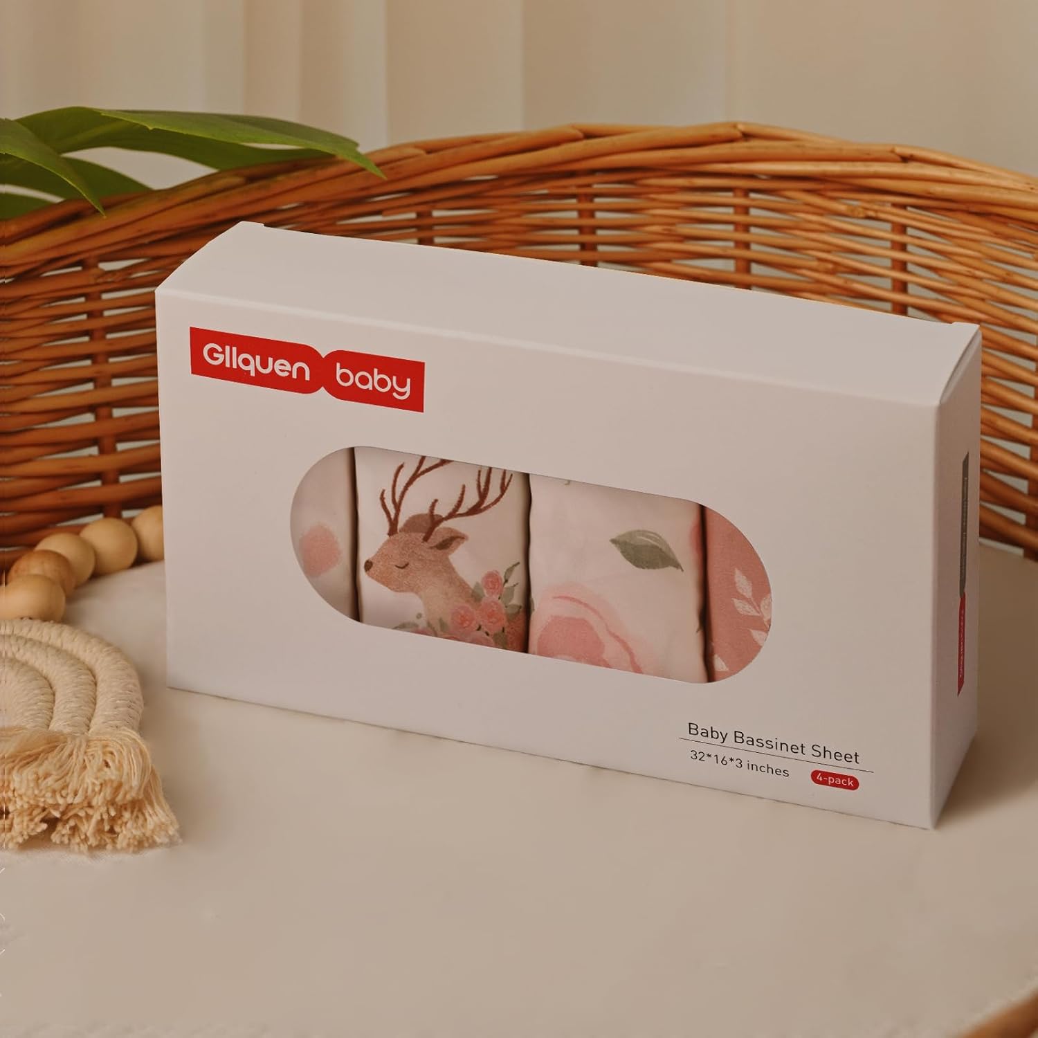 Gllquen Baby Bassinet Sheets 4 Pack, Breathable Cozy Fitted Mattress Sheet, Elastic Travel Crib Fashionable Floral Pattern, Standard Cradle Safe Sheets for Baby Boys Girls 32"x16"(Deer & Rose)
