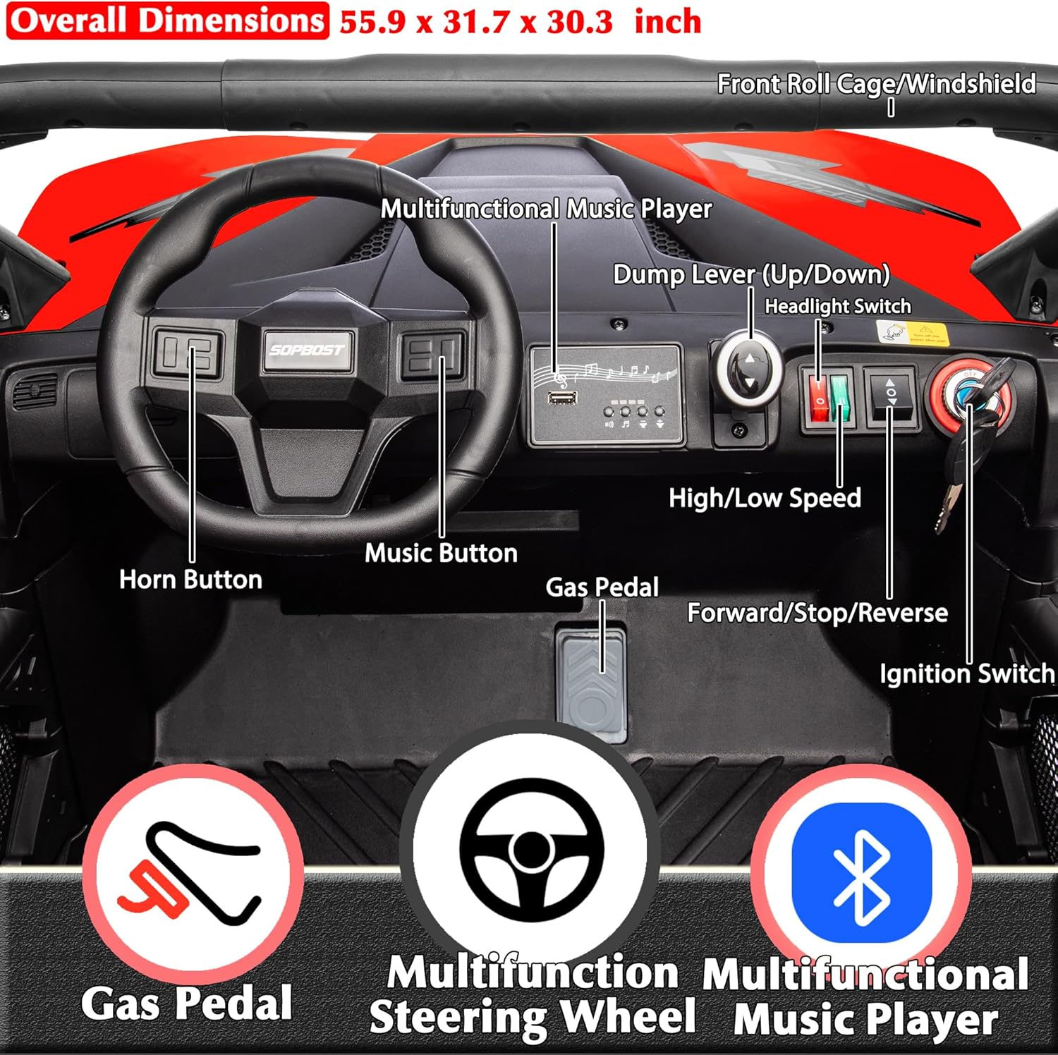 - Kids’ UTV with 1.4 Cu.Ft Dump Bed: The dump bed of this kids’ UTV is electric, kids can lift and down the dump bed by operating the joystick and handle, and it comes with a plastic shovel, your little kids can enjoy a transport experience with this side-by-side UTV. And the multifunctional music panel provides built-in music and devices connection functions (AUX/USB interface and wireless connection), enhances entertainments of this kids' toy car.
