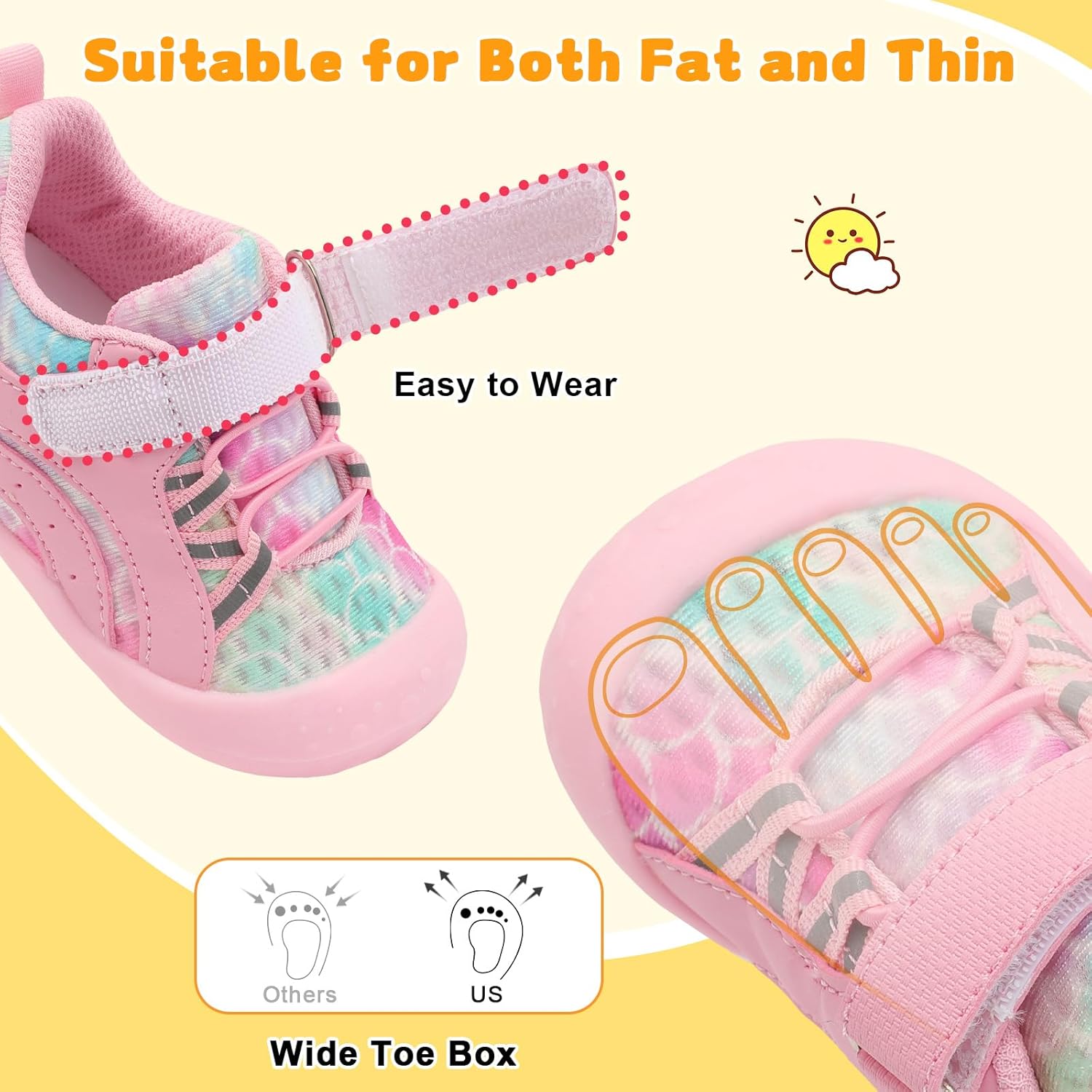 • QUICK DRY UPPERS: These baby shoes uppers are made of breathable and stretchy mesh fabrics, give your child comfortable and cool feel during play or sports