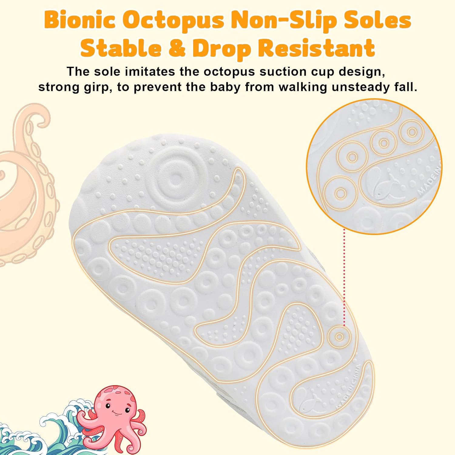 • TPR NON-SLIP SOLE: The sole imitates the octopus design, has been subjected to 2W+ friction tests, strong girp, to prevent the baby from walking unsteady fall
