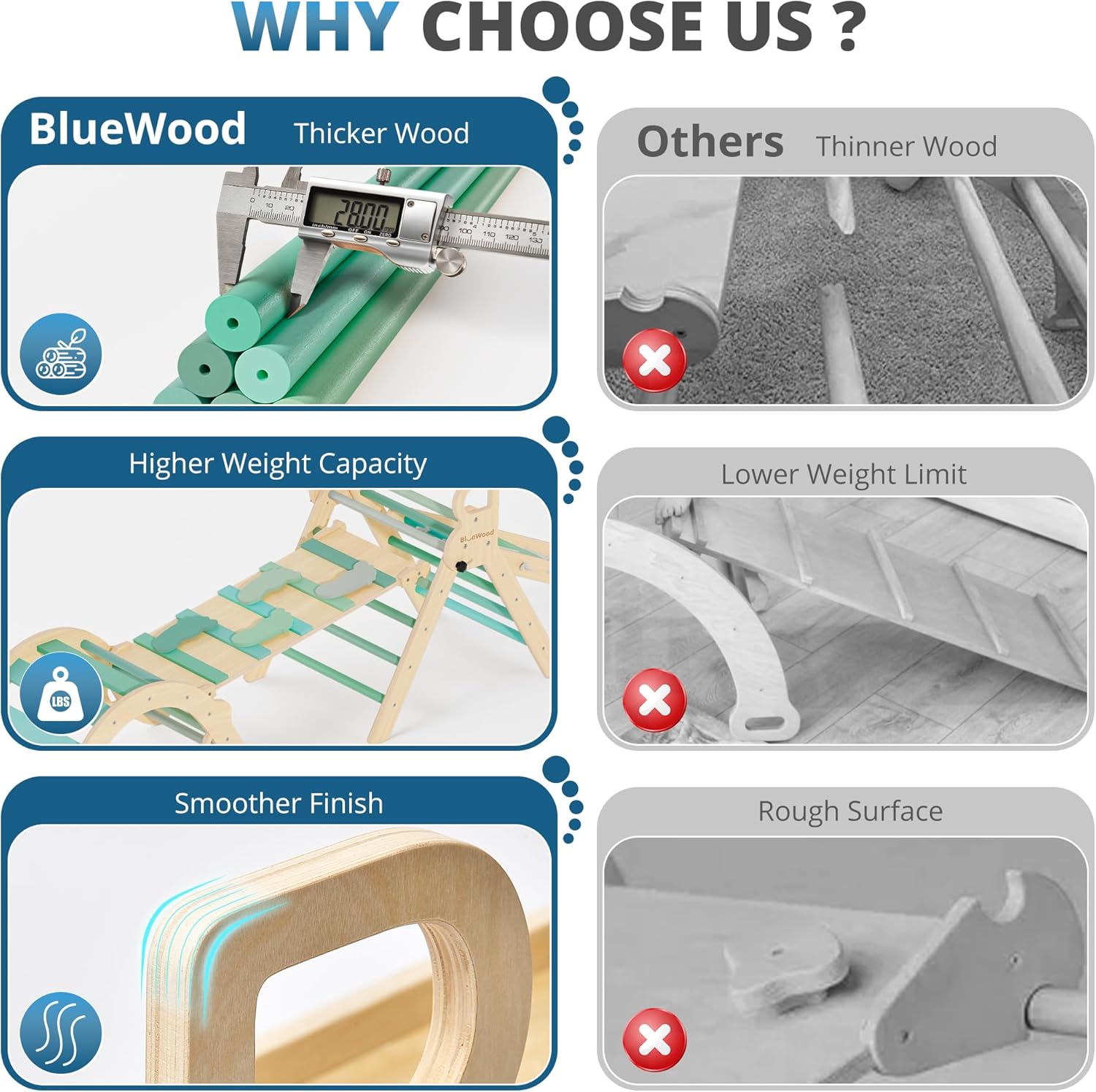 BlueWood 10-in-1 Pikler Triangle Set, Toddler Climbing Toys Indoor, Montessori Climber, Baby Jungle Gyms with Arch, Extra Rope Ladder & Footprint Balance Beam - Emerald Forest