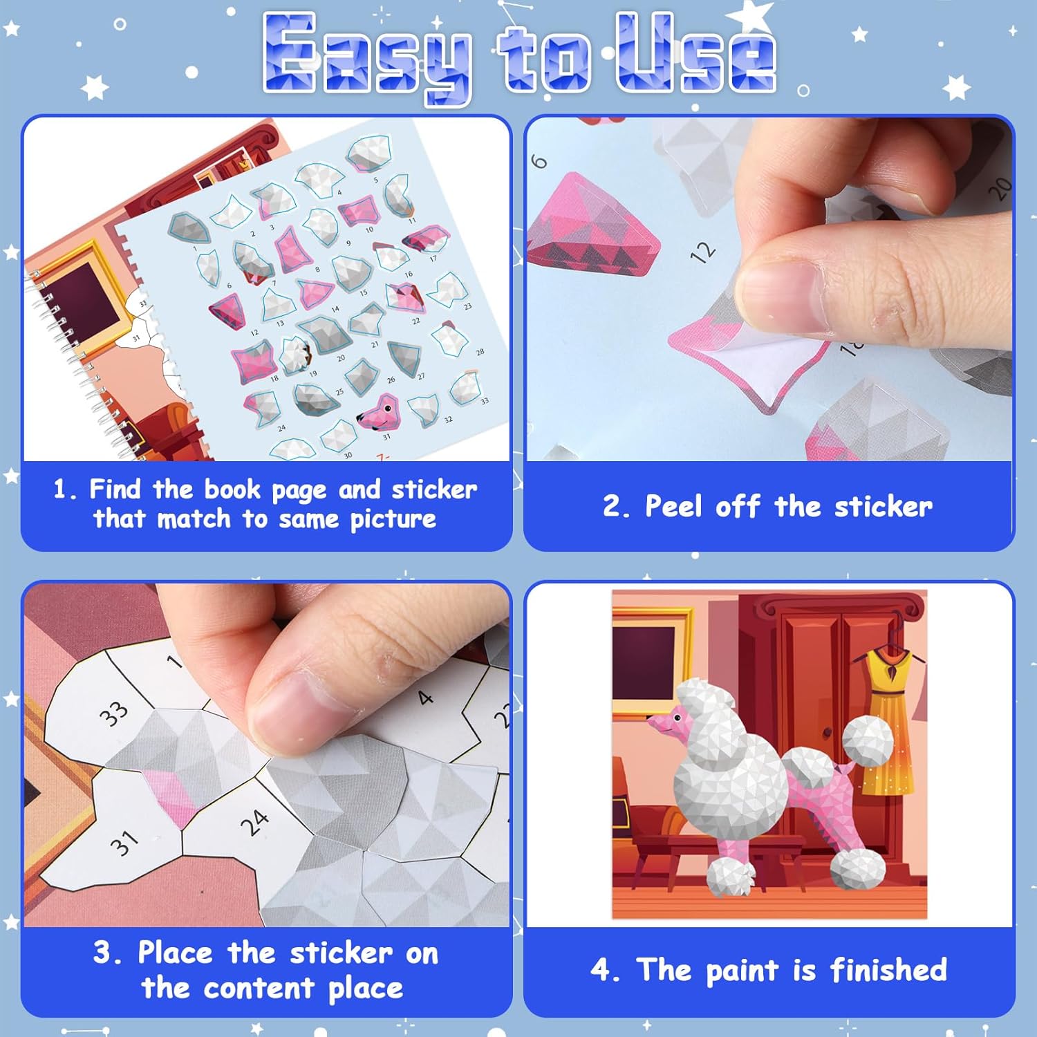 - Sticker Paint Books: Our sticker crafts set consists of 4 paint by sticker books. Each book contains 8 pages of distinct images, providing a total of 32 pictures to complete. Immerse yourself in the realms of mermaids, cats, dogs, silly snack with each theme thoughtfully selected to ignite imagination. With a generous amount of stickers included, this set guarantees to fulfill all your creative desires.