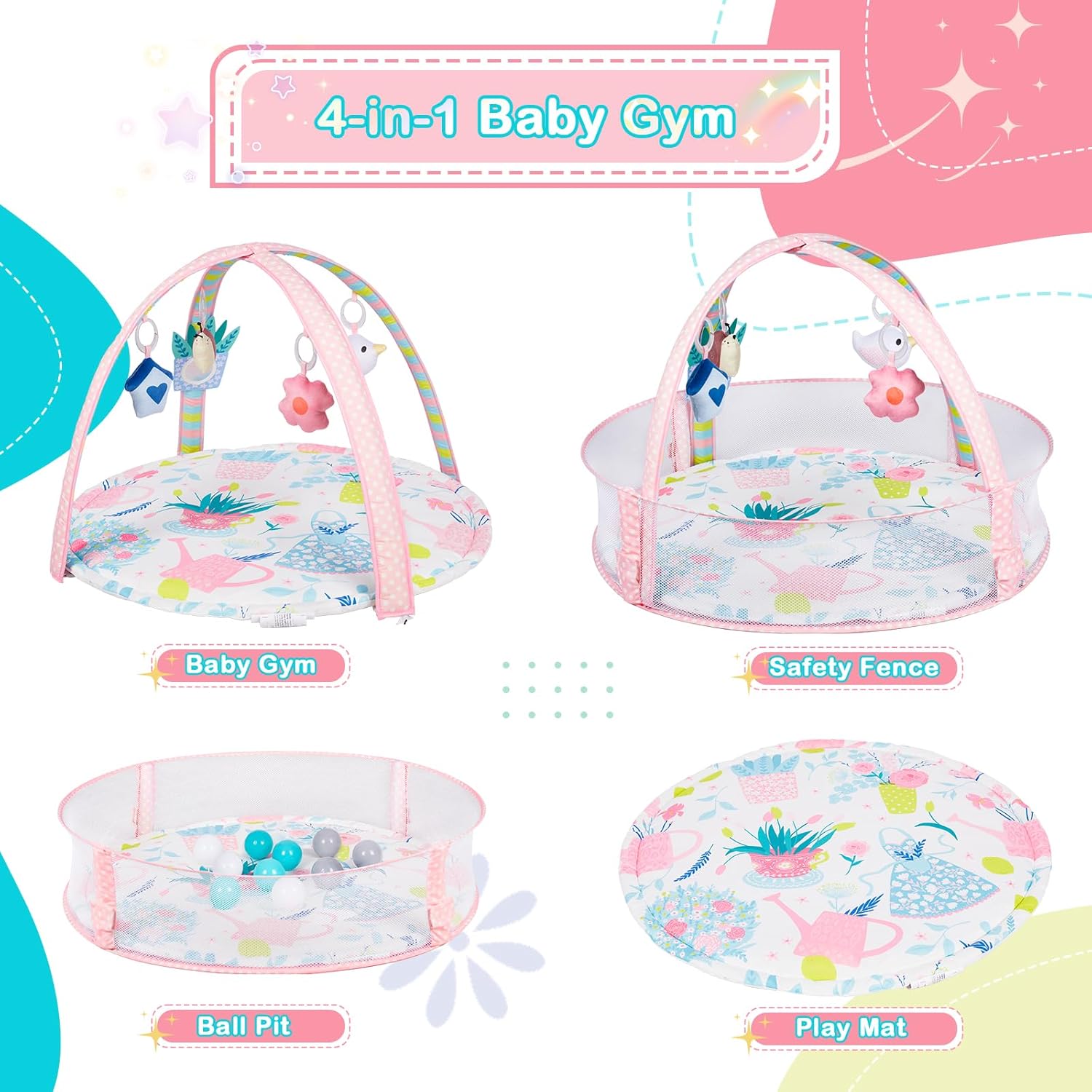 - 4 in 1 Infant Activity Center: Otrolepota baby play mat has 4 different uses;tummy time mat, baby gym, safety fence,ball pit with 10 balls included and cloud storage bag.