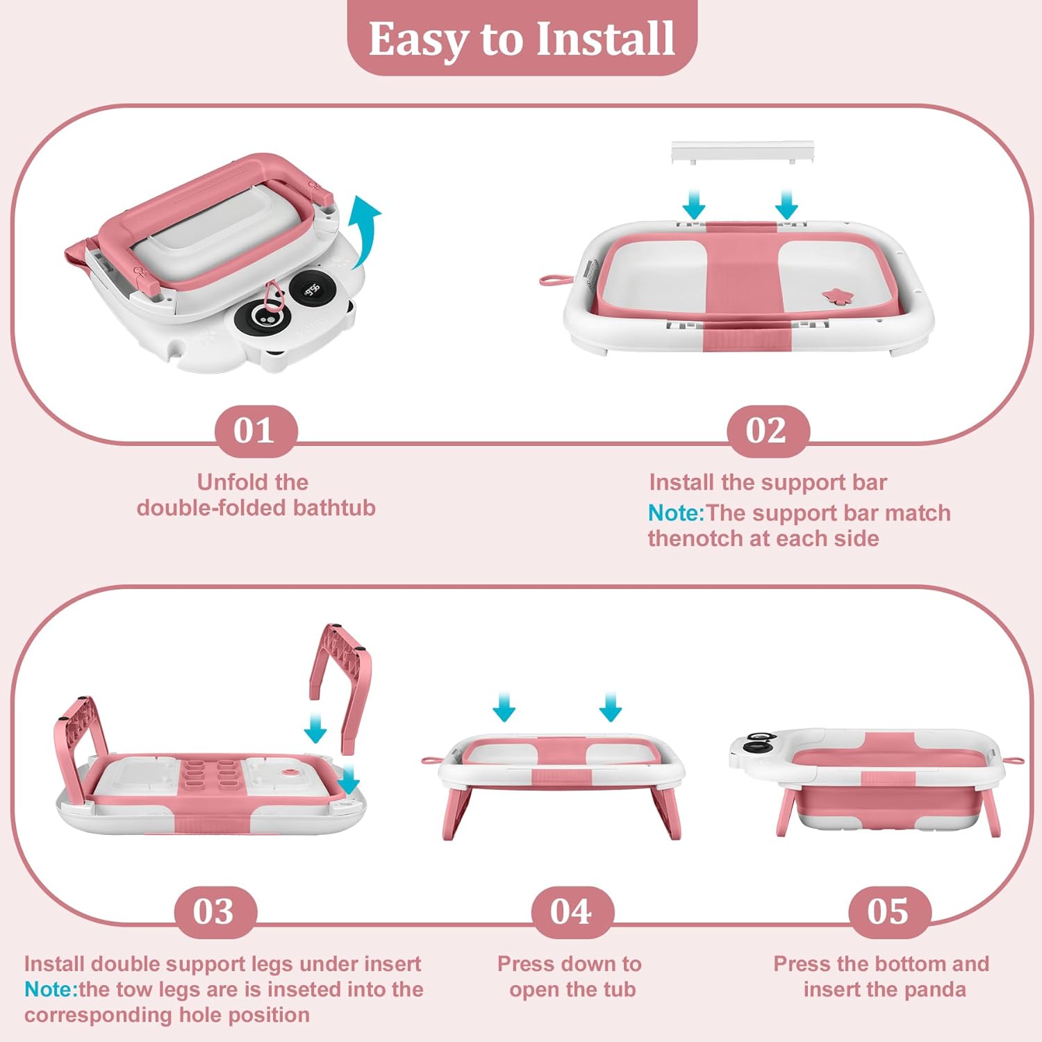 - Double-Fold & Detachable Leg Support: Our collapsible baby bathtub features an ingenious double-fold design, it even folds in half, folding the body into a square with a thickness of 4 inches. Convenient for storage and saving space!