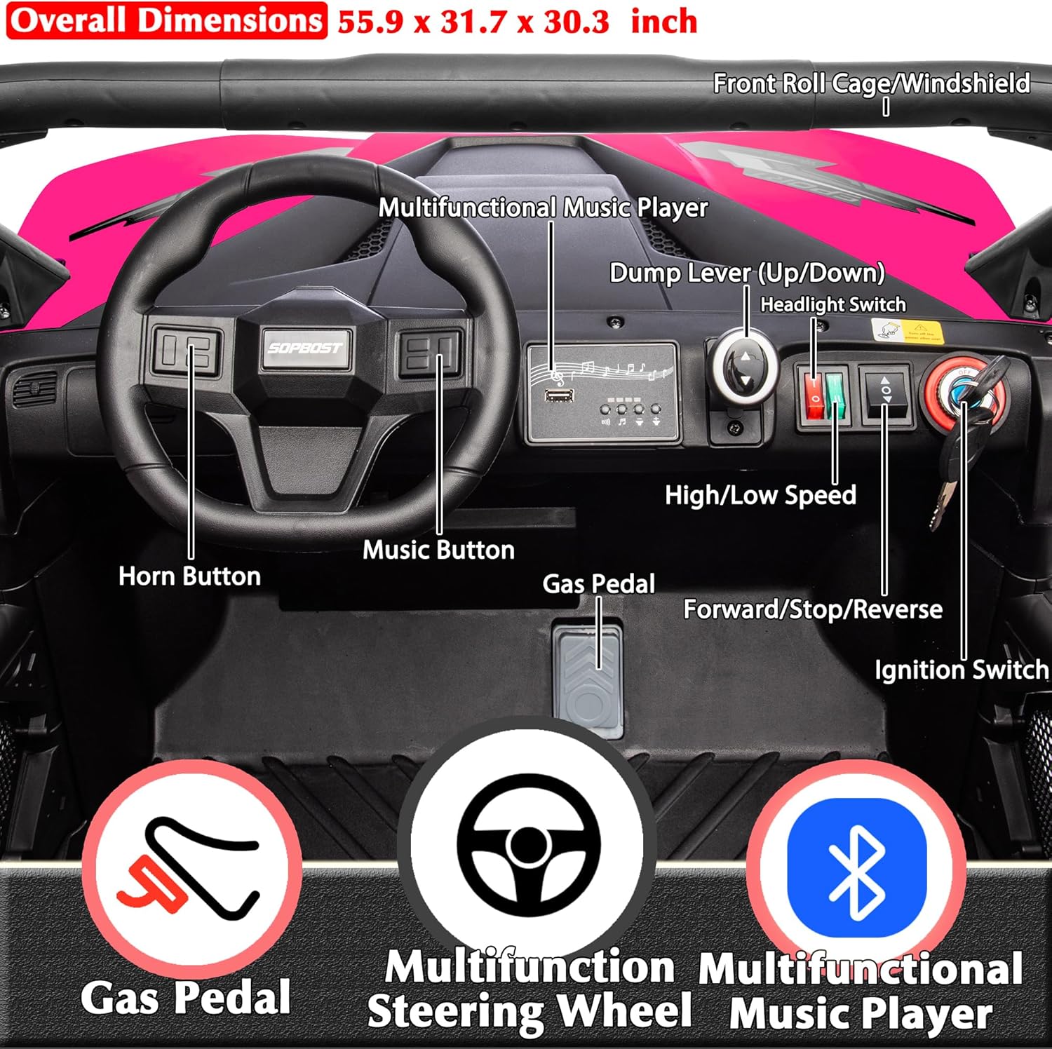 sopbost 24V Ride On Car with Remote Control 10Ah Battery Powered Ride On Toy for Big Kids to Drive 2 Seater UTV with Large Dump Bed, 4x75W Motors, Hot Pink & Black