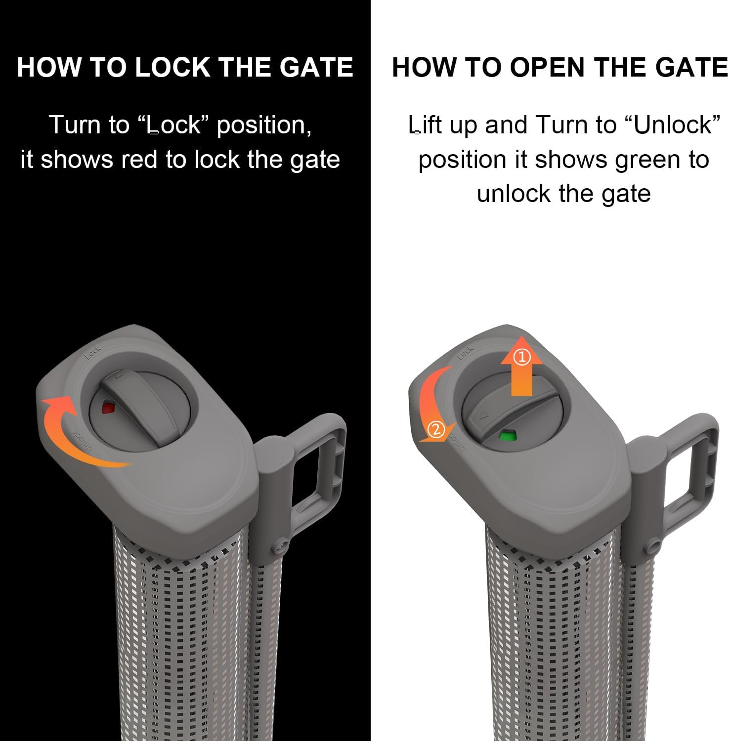 - 【Easy Operation With one Hand】The one-handed operation of this retractable baby gate allows you to open and close it while holding your child in your arms, with a simple two-step operation: 1. Press, twist and release the button; 2. Pull the handle to extend the pressure fit the stair gate, and when releasing the handle, the baby safety gate locks the release automatically