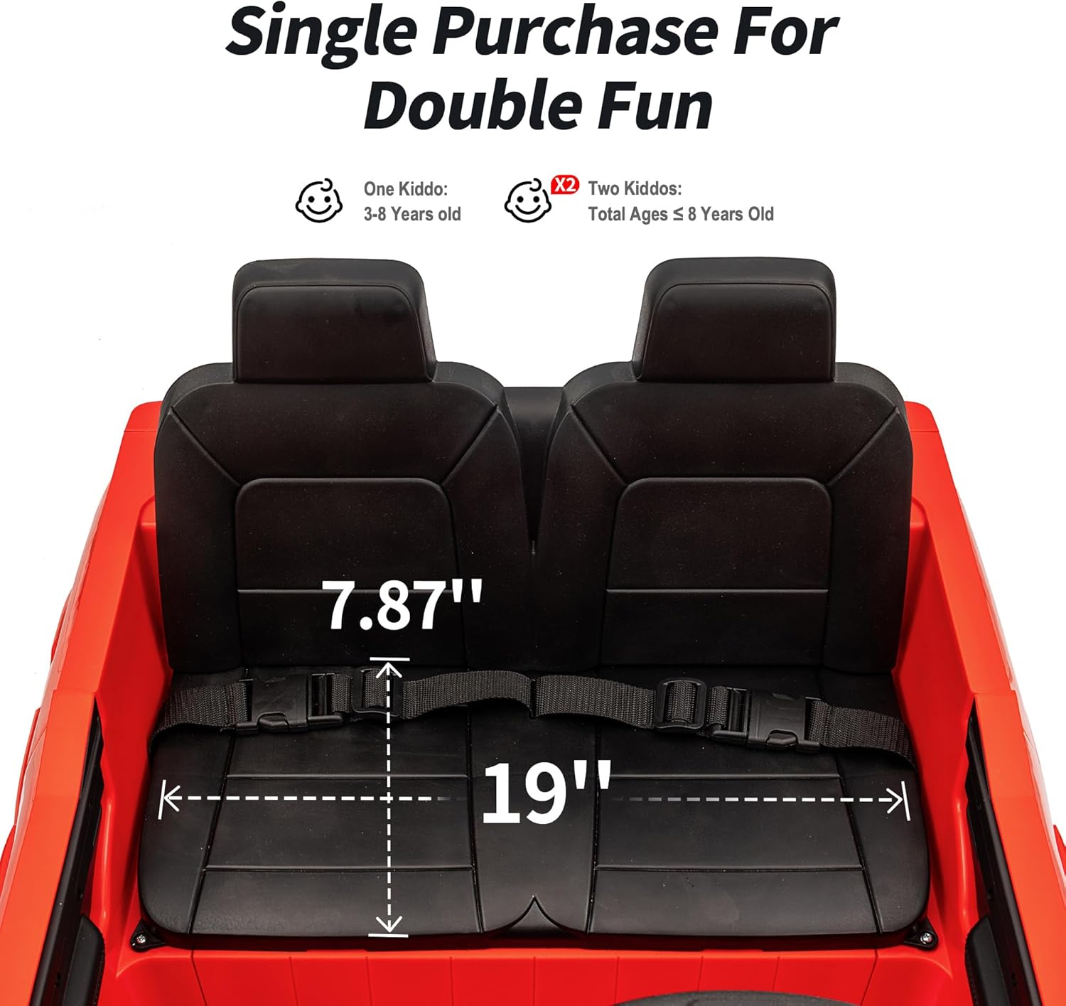 - 19" DUAL SEATER : This battery powered police kids car has ample seater, allowing two children to ride together comfortably under 110lbs. Adjustable seat belts and double-locking door design also ensure kid's safety.