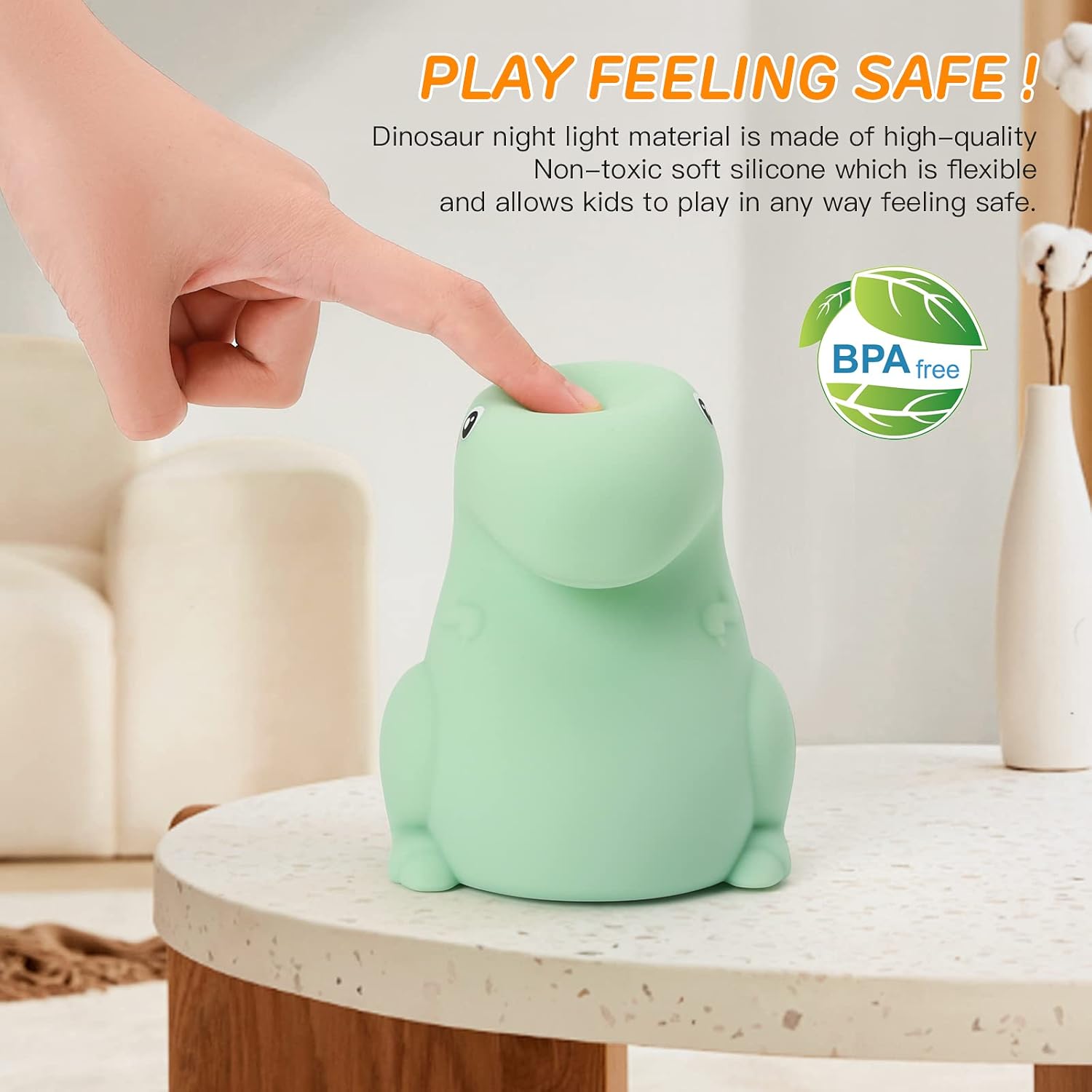 - 👶SAFETY & SQUISHY: This flexible and soft dinosaur Night Light material is made from BPA-free smooth silicone that allows you to play in any way and keeps its original shape after heavy long-term use, Washable to keep it clean forever! The one-piece design of the back parts cannot be dropped due to children's pulling, chewing, etc. To ensure the absolute safety of children's use, parents can be rest assured
