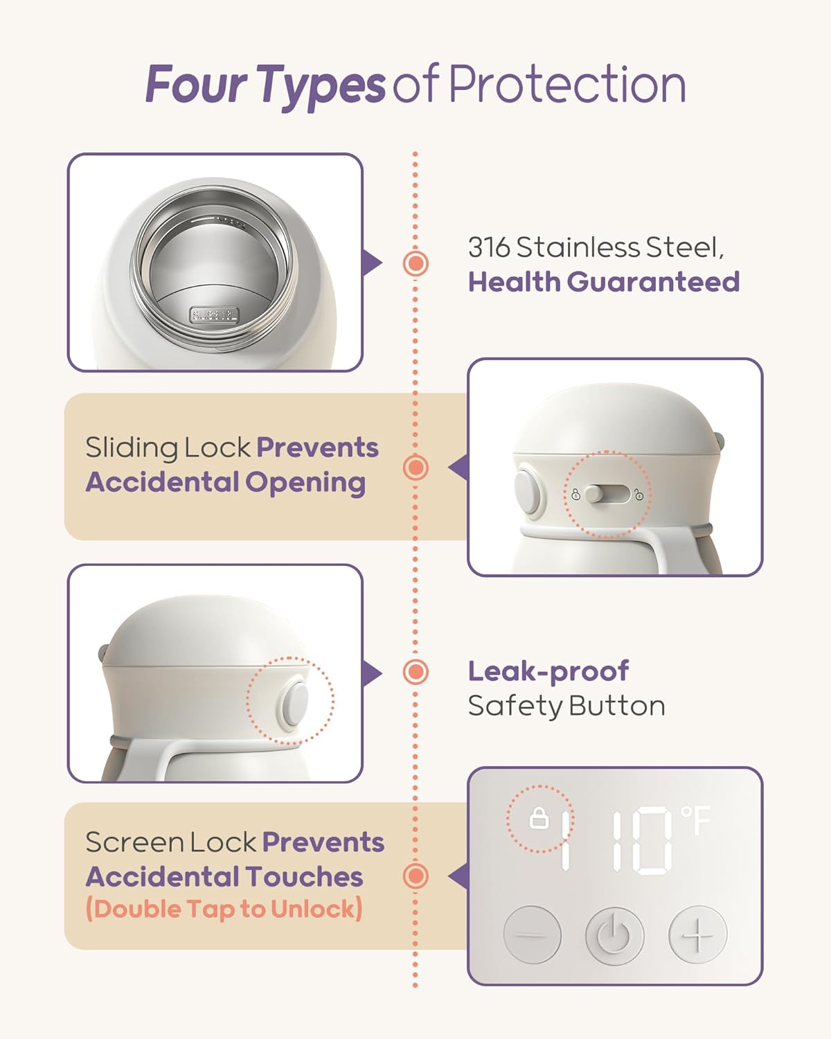 - Leak-Proof and Baby-Safe Design: This baby brew bottle warmer is designed with a secure, leak-proof lid and a child safety lock, preventing spills and misuse while providing peace of mind for parents.