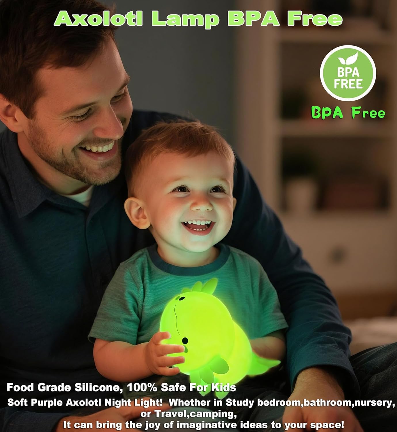 - Dimmable and BPA Free:Cute Green Axolotl Night Light for Kids,Choose food grade silicone material,BPA free Soft and pinchable,that won't heat up while in use.Safe material and design suitable for everyone including babies,axolotl lamp has two brightness modes.Turn on the switch and simply tap the Axolotl light to switch brightness