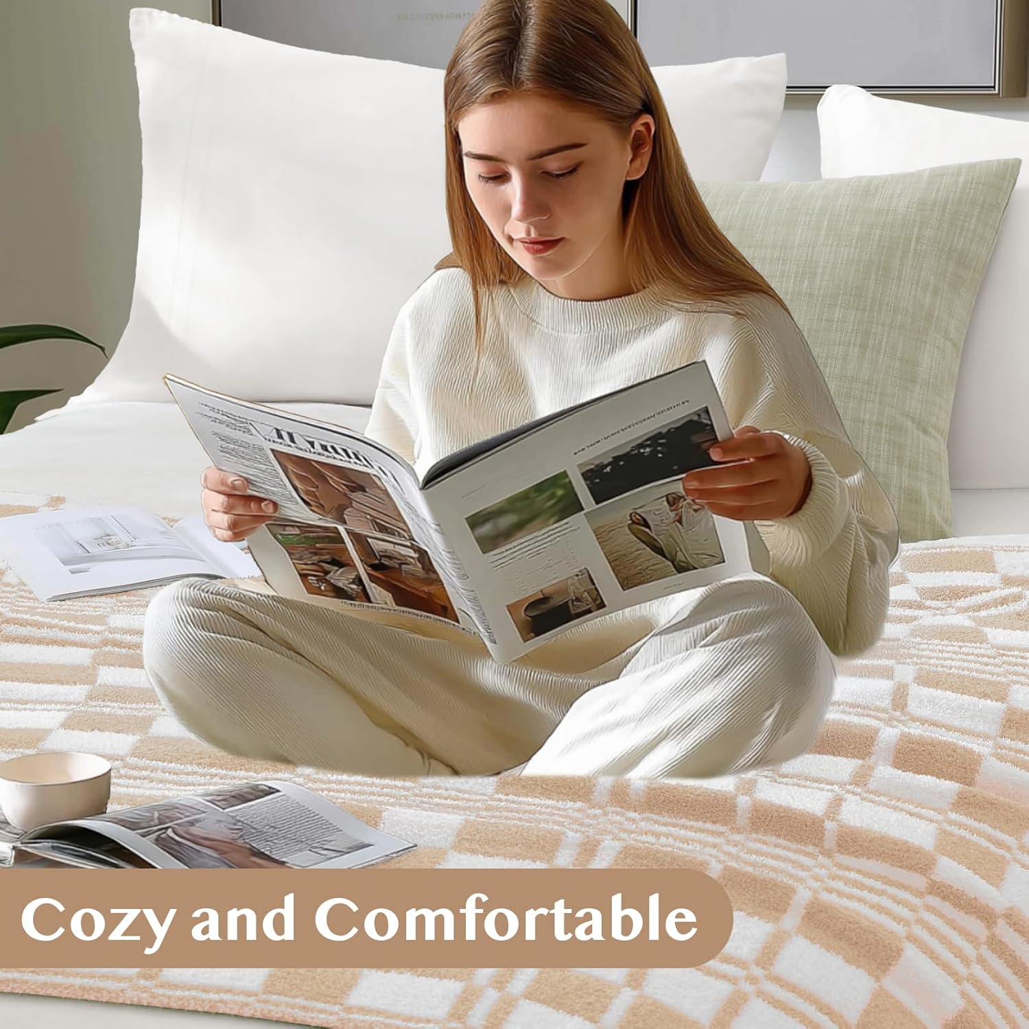 WRENSONGE Checkered Throw Blanket, Toast Almond Soft Cozy Fluffy Warm Hand Made Throw Blankets for Couch, Sofa, Chair, Bed, Camping, Picnic, Travel Lightweight Bed Blanket - 50"*60"