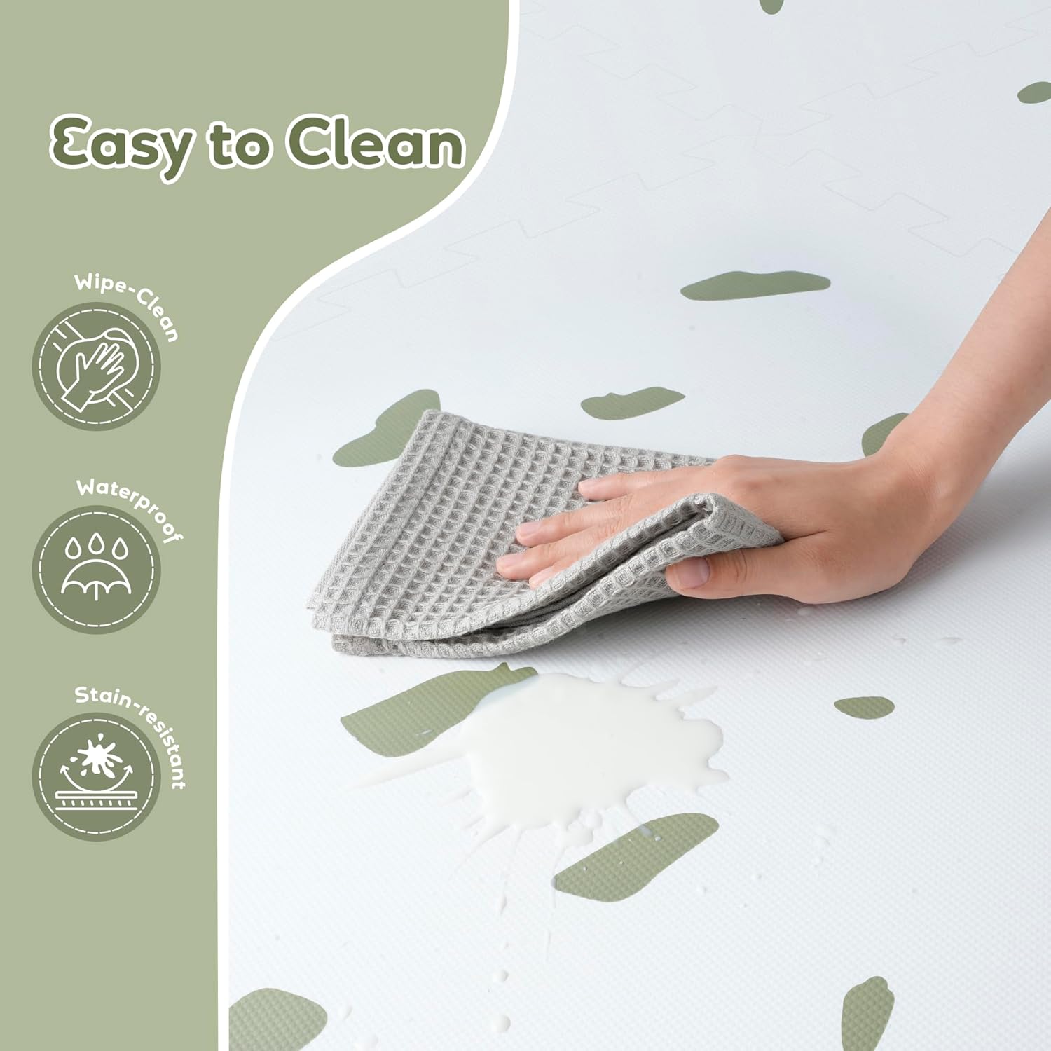 - WATERPROOF AND EASY TO CLEAN: The surface of the baby playmat is 100% waterproof. Whether it's occasional chocolate, milk, or cake, quickly wipe it clean with a damp cloth; Waterproof foam pads prevent spills and stains, ensuring durability,Easy to clean, perfect for busy parents